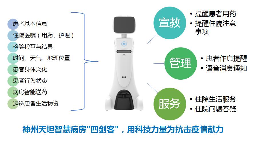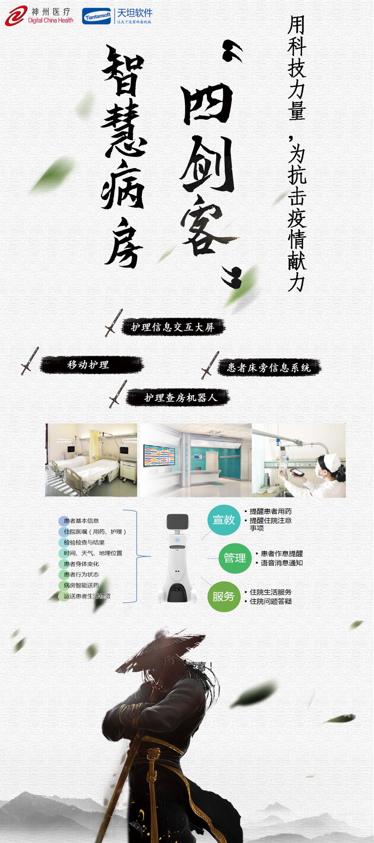 神州天坦智慧病房"四劍客",是神舟天坦憑借著十余年在醫(yī)療衛(wèi)生領域中豐富的行業(yè)經(jīng)驗積累,并針對此次新冠疫情防治的一線醫(yī)護人員日常工作需求,優(yōu)選出的可以快速搭建、臨床實用性高的智慧病房四大子系統(tǒng),具有很強的建設價值。以軟硬件、物聯(lián)網(wǎng)和人工智能技術,構筑起防治新型冠狀病毒的信息化關口,為醫(yī)護人員診療工作、患者住院服務進行保駕護航。以科技的力量為抗擊疫情獻力,我們一起攜手同行、共克時艱。贏得這場沒有硝煙的戰(zhàn)“疫”,中國加油!戰(zhàn)“疫”必勝!