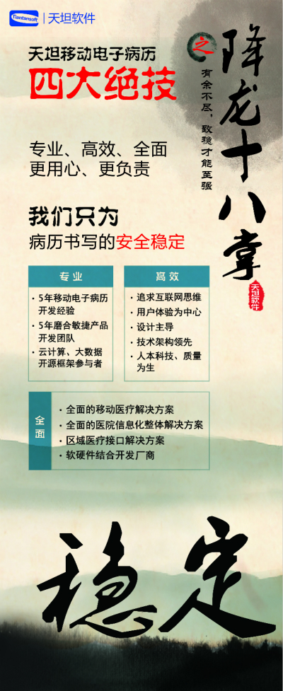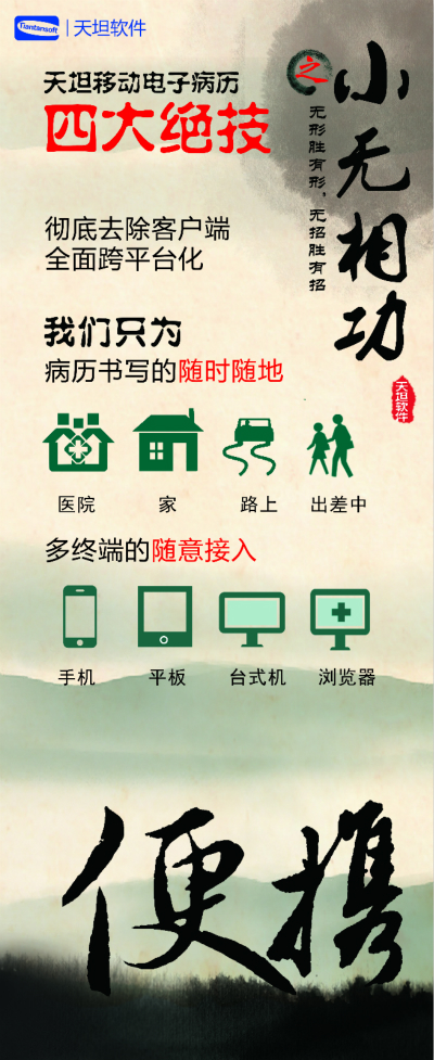 天坦軟件,作為國(guó)內(nèi)移動(dòng)電子病歷的先行者,盛裝亮相京交會(huì)。在會(huì)上展示了以“天坦移動(dòng)電子病歷”為核心的醫(yī)院整體信息化系統(tǒng),受到眾多參觀者的關(guān)注。天坦軟件始終堅(jiān)持以“讓天下沒(méi)有難看的病”為宗旨,致力于醫(yī)療事業(yè)發(fā)展。為中國(guó)醫(yī)療衛(wèi)生行業(yè)的信息化建設(shè)以及個(gè)人健康服務(wù)提供從硬件到軟件、從技術(shù)到服務(wù)的全面解決方案,是中國(guó)醫(yī)療信息化市場(chǎng)中快速成長(zhǎng)的獨(dú)立軟件廠商之一。數(shù)年來(lái),一直堅(jiān)持研發(fā)以移動(dòng)電子病歷為核心的醫(yī)院信息化系統(tǒng),從移動(dòng)框架的病歷編輯器到跨平臺(tái)的移動(dòng)醫(yī)療解決方案,為整個(gè)病歷信息化行業(yè)注入了極強(qiáng)的創(chuàng)新活力。 “天坦移動(dòng)電子病歷”為核心的醫(yī)院整體信息化系統(tǒng)秉承“高效應(yīng)用、信息互通”的基本理念,是專門為醫(yī)院設(shè)計(jì)開(kāi)發(fā)的醫(yī)療信息化系統(tǒng)的核心組成部分。具有高效、安全、穩(wěn)定、易用、移動(dòng)、智能等特點(diǎn),除此之外,還具有穩(wěn)定、完全跨平臺(tái)運(yùn)行、功能強(qiáng)大、系統(tǒng)性能卓越等巨大優(yōu)勢(shì)。