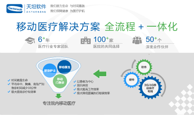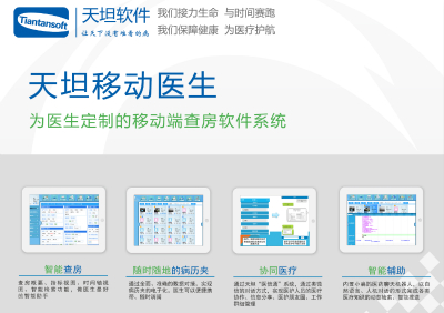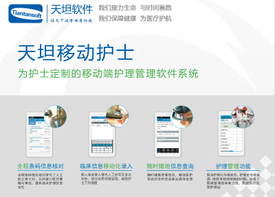除了卒中綠色通道之外,天坦軟件在大會(huì)上還展出了移動(dòng)醫(yī)護(hù)產(chǎn)品,主要涉及天坦移動(dòng)醫(yī)生和天坦移動(dòng)護(hù)士。天坦移動(dòng)醫(yī)生是專(zhuān)門(mén)為醫(yī)生定制的移動(dòng)查房系統(tǒng),具有智能查房,協(xié)同醫(yī)療、智能輔助等特點(diǎn),是隨時(shí)隨地的病歷夾;天坦移動(dòng)護(hù)士是專(zhuān)門(mén)為護(hù)士定制的移動(dòng)護(hù)理系統(tǒng),支持全程條碼信息核對(duì),臨床信息移動(dòng)化錄入,隨時(shí)隨地信息查詢(xún)以及護(hù)理管理等。