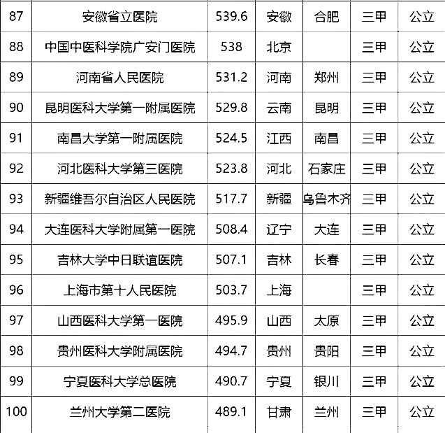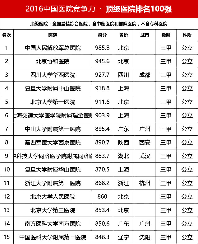 “頂級醫(yī)院100強”采用的排名指標體系包括四個方面:醫(yī)院最優(yōu)規(guī)模(實開床位數(shù)、年門急診量、年出院量、全院人數(shù));醫(yī)療技術(正高職稱人數(shù)/全院人數(shù)、全院醫(yī)師人數(shù)/實開床位數(shù)、醫(yī)療設備資產(chǎn)/總資產(chǎn)、年住院手術量/年出院量、國家級衛(wèi)紀委臨床重點專科/總專科書、ICU床占比);醫(yī)院運行(平均住院天數(shù)、床位使用率、門診均次費用/當?shù)厝司鵊DP、住院均次費用/當?shù)厝司鵊DP、外省住院病人占比);學術影響力(院士人數(shù)、學術領袖占比、教育部重點學科及重點實驗室/總??茢?shù)、本年度獲國家自然科學基金項目數(shù)量和總全額)。