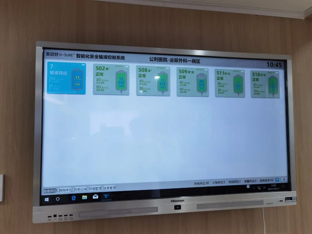 確定了用哪種輸液監(jiān)控技術(shù),變成“智慧輸液”卻還需要一個信息化工程,這就是信息護士產(chǎn)生的原因。以智慧輸液為例,要讓輸液信息“跑”起來,就要一張“網(wǎng)”——具象地看就是智慧病房的7個屏:病床有兩個屏,大屏功能很多,不但可以看視頻、叫護士……還可以完成出院結(jié)算;小屏就是以前床頭的“小白卡”,顯示患者姓名、護理級別等。護士站有三個屏,一個大屏是輸液控制屏,顯示全病區(qū)的輸液情況;另外一個大屏相當于寫字板,就是護士站常見的手寫黑板的“升級版”,除了即時更新醫(yī)囑外,還可以在病房看到正在做的手術(shù)情況等;此外還有護士站管理屏。再加上走廊屏、房間屏,所有的信息一次輸入、全程“跑動”。